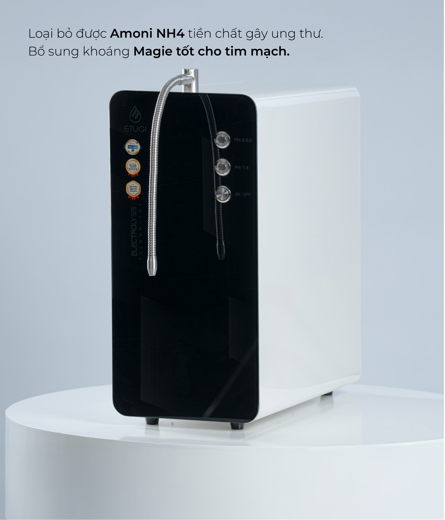 - Công nghệ điện phân trực tiếp từ nước RO, không cần thêm lõi tạo khoáng.