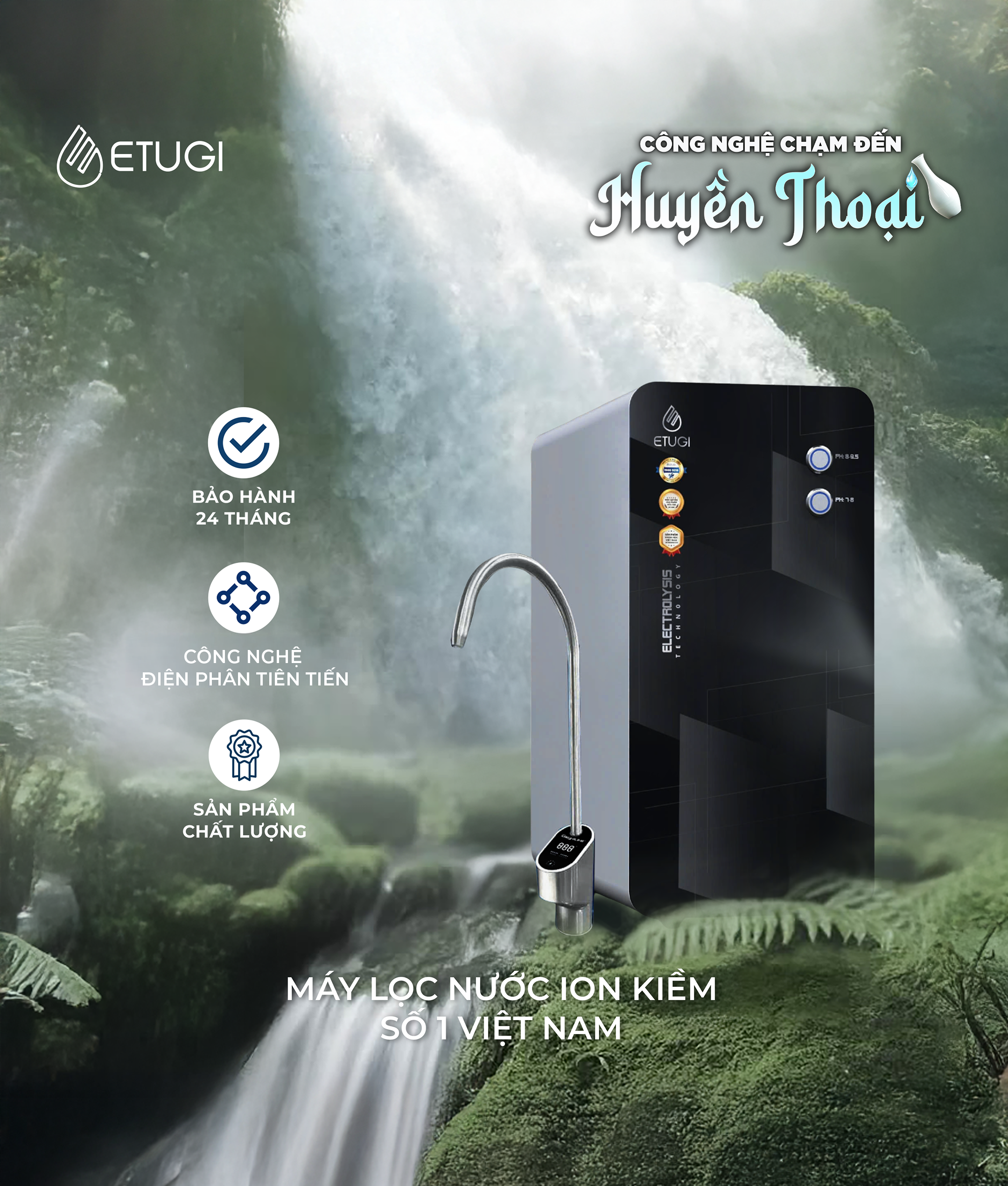 - Công nghệ điện phân trực tiếp từ nước RO, không cần thêm lõi tạo khoáng.